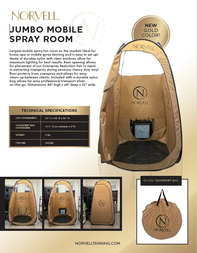 The Norvell Jumbo Mobile Spray Room & Fan Bundle was designed in close partnership with spray tanning professionals and is the largest tent on the market. The Norvell Jumbo Mobile Spray Room is ideal for Home, Spa or Mobile spray tanning and opens to a spectacular 86" high x 48" deep x 52" wide.